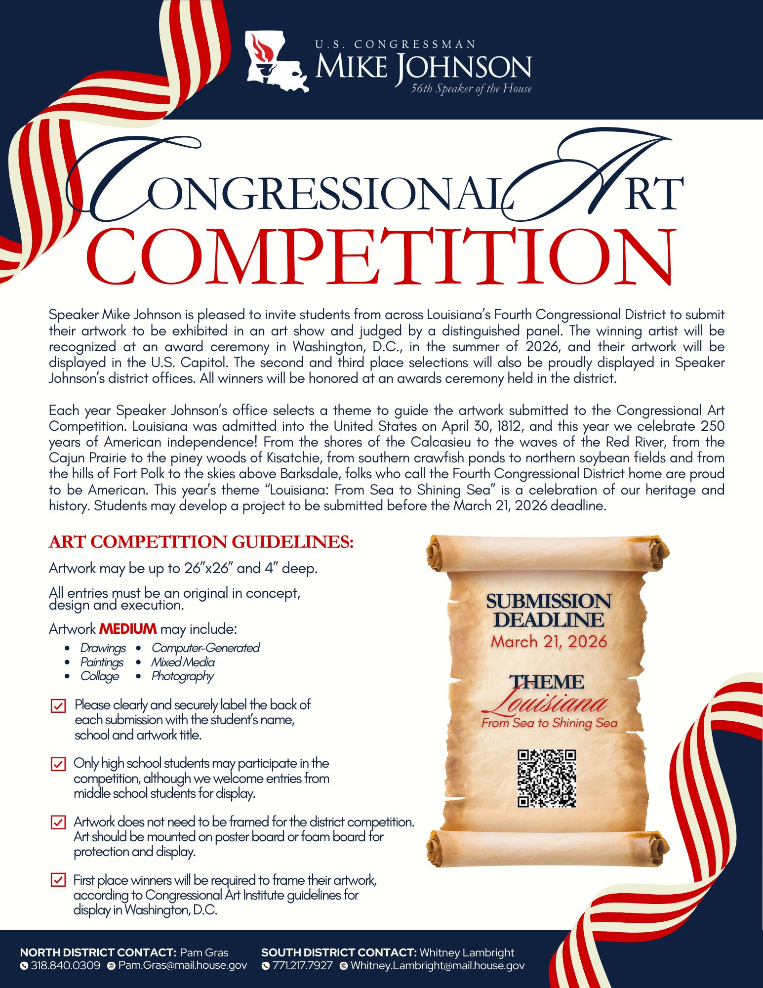 To express interest in the competition or to request more information, contact Pamela Gras at 318-840-0309 or pam.gras@mail.house.gov.